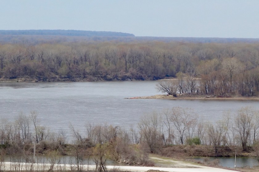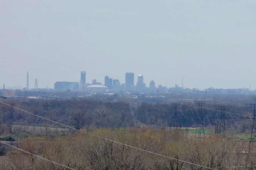 We then proceeded about 1/4 mile to the Confluence Tower to take in a commanding view at 160 ft. Immediately to the west is the confluence of the two great American rivers: the Missouri empties into the Mississippi. A spit of land marks the spot where they come together. The weather was clear enough (although very windy) to see downtown St. Louis, 19 miles to the south.